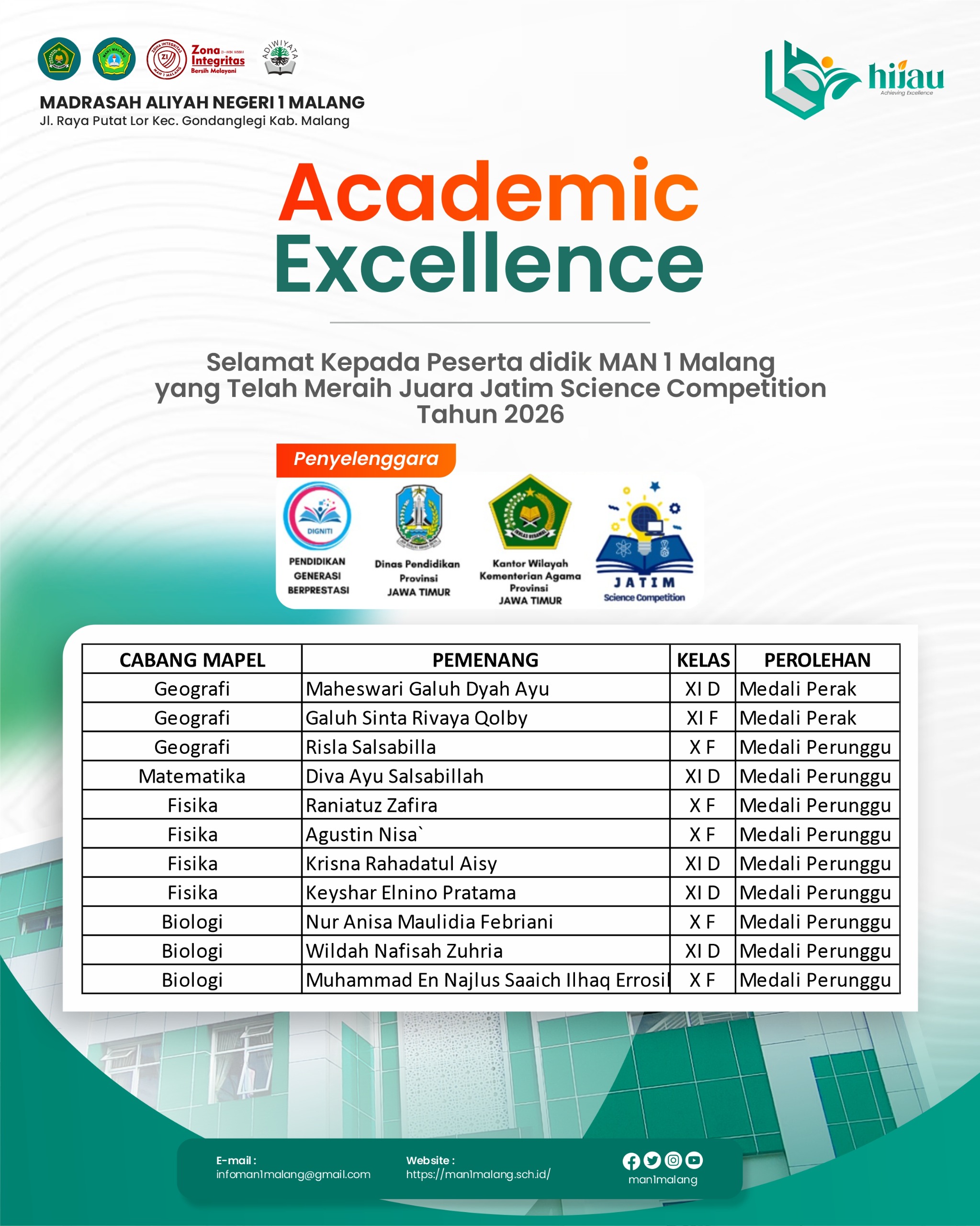 Kab. Malang (MAN 1 Malang) – Prestasi akademik kembali ditorehkan oleh peserta didik MAN 1 Malang dalam ajang Jatim Science Competition 2026 yang dilaksanakan secara daring pada Kamis, 26 Februari 2026. Kompetisi yang diikuti oleh pelajar jenjang SD/MI, SMP/MTs, hingga SMA/MA/SMK se-Jawa Timur ini diselenggarakan oleh DIGNITI bekerja sama dengan Dinas Pendidikan Provinsi Jawa Timur serta Kantor Wilayah Kementerian Agama Provinsi...Read More