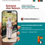 MALANG – Carissa Kheyra Evelyn Jatmika, siswi kelas XI-E MAN 1 Malang, berhasil merebut juara ketiga nasional bidang Da’i dalam Festival Ramadan Nusantara 2026. Prestasi gemilang ini diraih pada Lomba Da’i Muda SMP/SMA Tingkat Nasional yang diselenggarakan Lembaga Bina Prestasi Nusantara bekerja sama dengan LDK Karisma Politeknik Negeri Sriwijaya. Kompetisi yang berlangsung 1 Februari hingga 2 Maret 2026 itu mengusung semangat pengembangan dakwah di kalangan generasi muda. Carissa sukses mengungguli ratusan...Read More