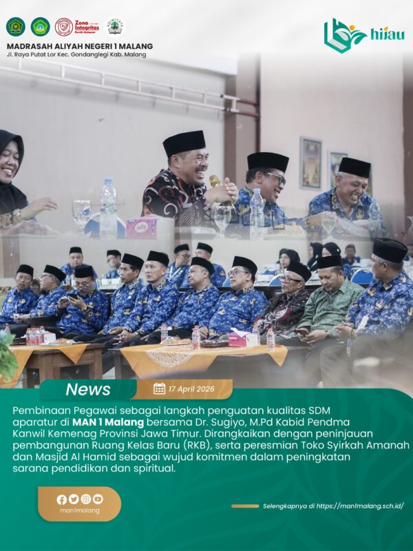 Rabu, 8 Oktober 2025 — Rombongan dari MTsN 7 Malang melaksanakan kegiatan studi tiru Penilaian Mandiri Pembangunan Zona Integritas (PMPZI) ke MAN 1 Malang. Kegiatan ini bertujuan untuk mempelajari berbagai praktik baik dalam tata kelola madrasah, peningkatan pelayanan publik,...