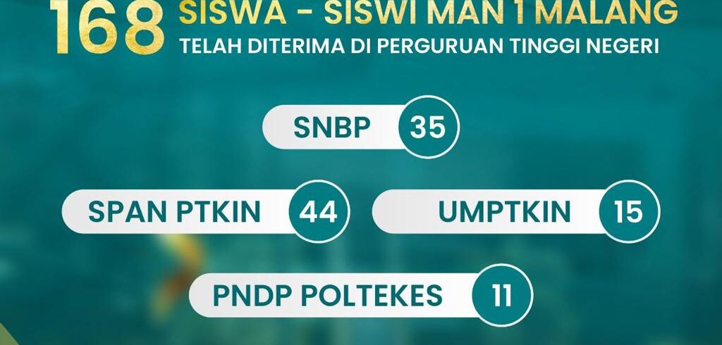 Hasil Seleksi Nasional Berdasarkan Tes (SNBT) Perguruan Tinggi Negeri 2023 resmi diumumkan pada Selasa, 20 Juni 2023. Pengumuman ini bisa dilihat pada website resmi https://pengumuman-snbt-snpmb.bppp.kemdikbud.go.id/. Hal ini memberikan kegembiraan yang luar biasa bagi peserta didik MAN 1 Malang. Pasalnya sebanyak 63 peserta didik MAN 1 Malang...Read More