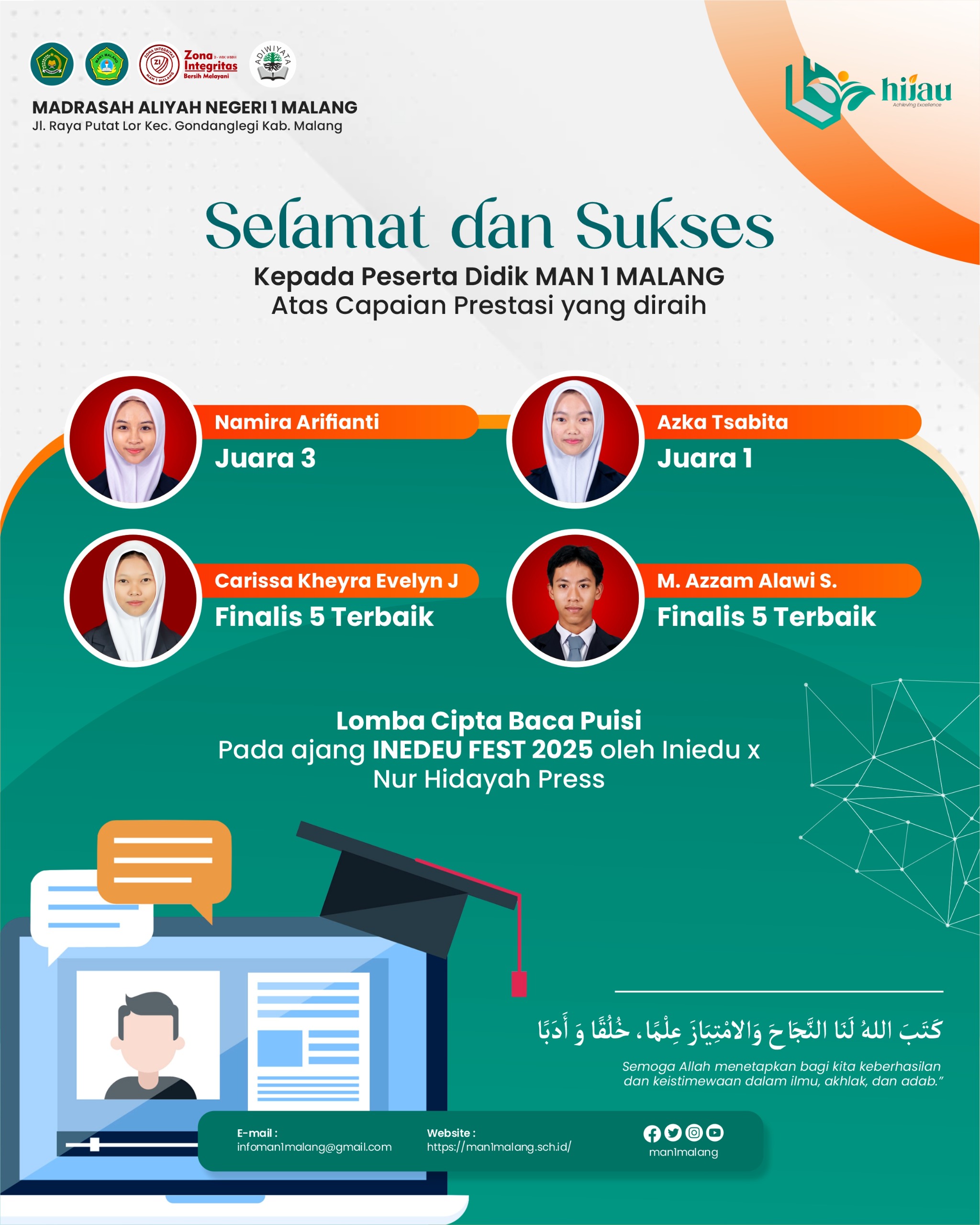 Kab. Malang (MAN 1 Malang) – Empat peserta didik MAN 1 Malang kembali menorehkan prestasi membanggakan pada ajang INEDEU FEST 2025 yang diselenggarakan oleh Iniedu x Nur Hidayah Press. Dalam kategori Lomba Cipta Baca Puisi, mereka berhasil menempati posisi terbaik dan membawa nama madrasah harum di tingkat nasional. Adalah Azka Tsabita yang berhasil meraih Juara 1, disusul oleh Namira Arifianti sebagai Juara 3. Sementara itu, Carissa Kheyra...Read More
