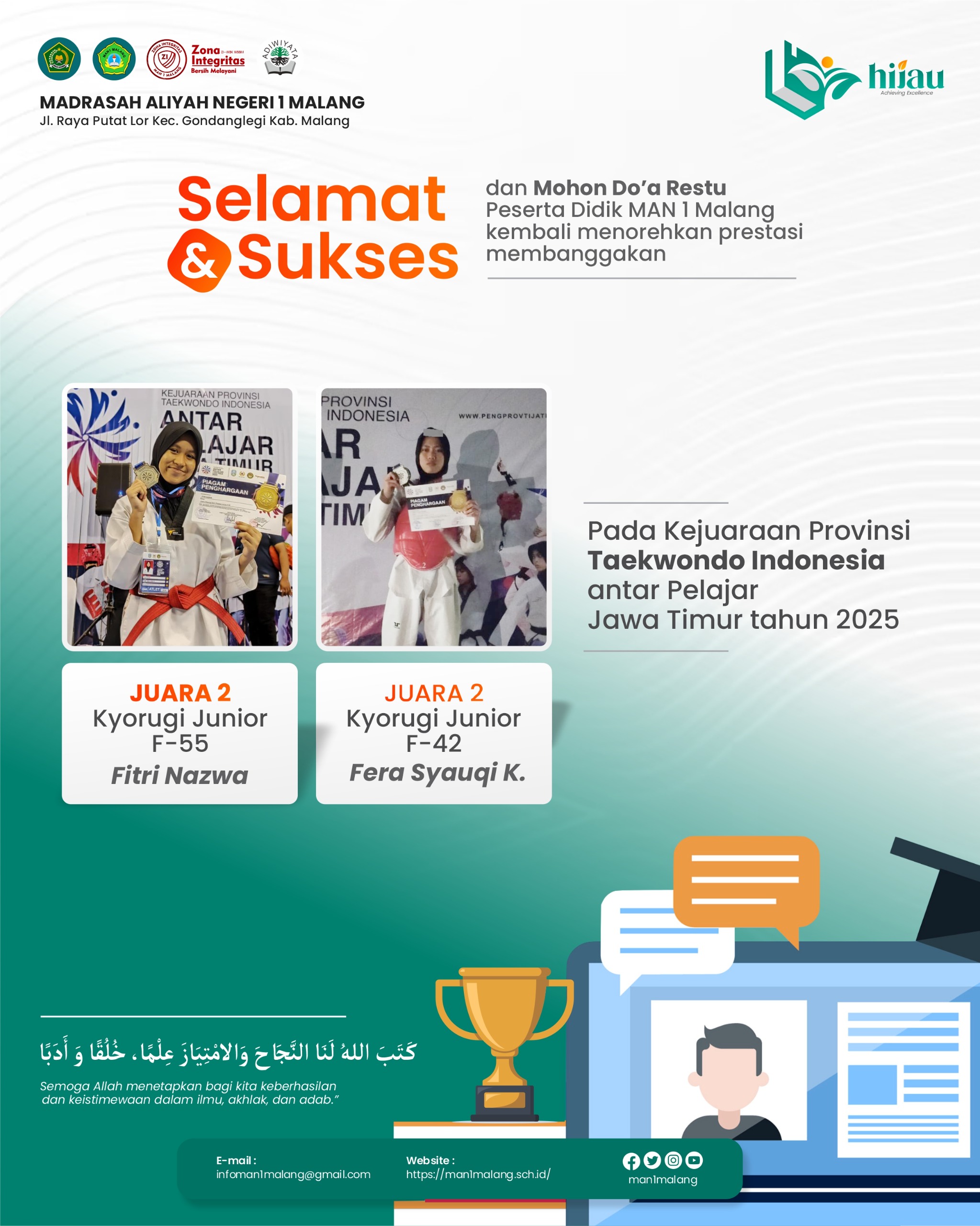 Kab. Malang (MAN 1 Malang) — Dua siswi MAN 1 Malang kembali menorehkan prestasi gemilang pada ajang Kejuaraan Provinsi Taekwondo Indonesia antar Pelajar Jawa Timur tahun 2025 yang digelar di GOR Gelora Pancasila, Surabaya. Dalam kompetisi bergengsi tersebut, Fitri Nazwa berhasil meraih Juara 2 Kyorugi Junior F-55, sementara Fera Syauqi K. juga sukses membawa pulang Juara 2 Kyorugi Junior F-42. Kedua atlet muda ini...Read More