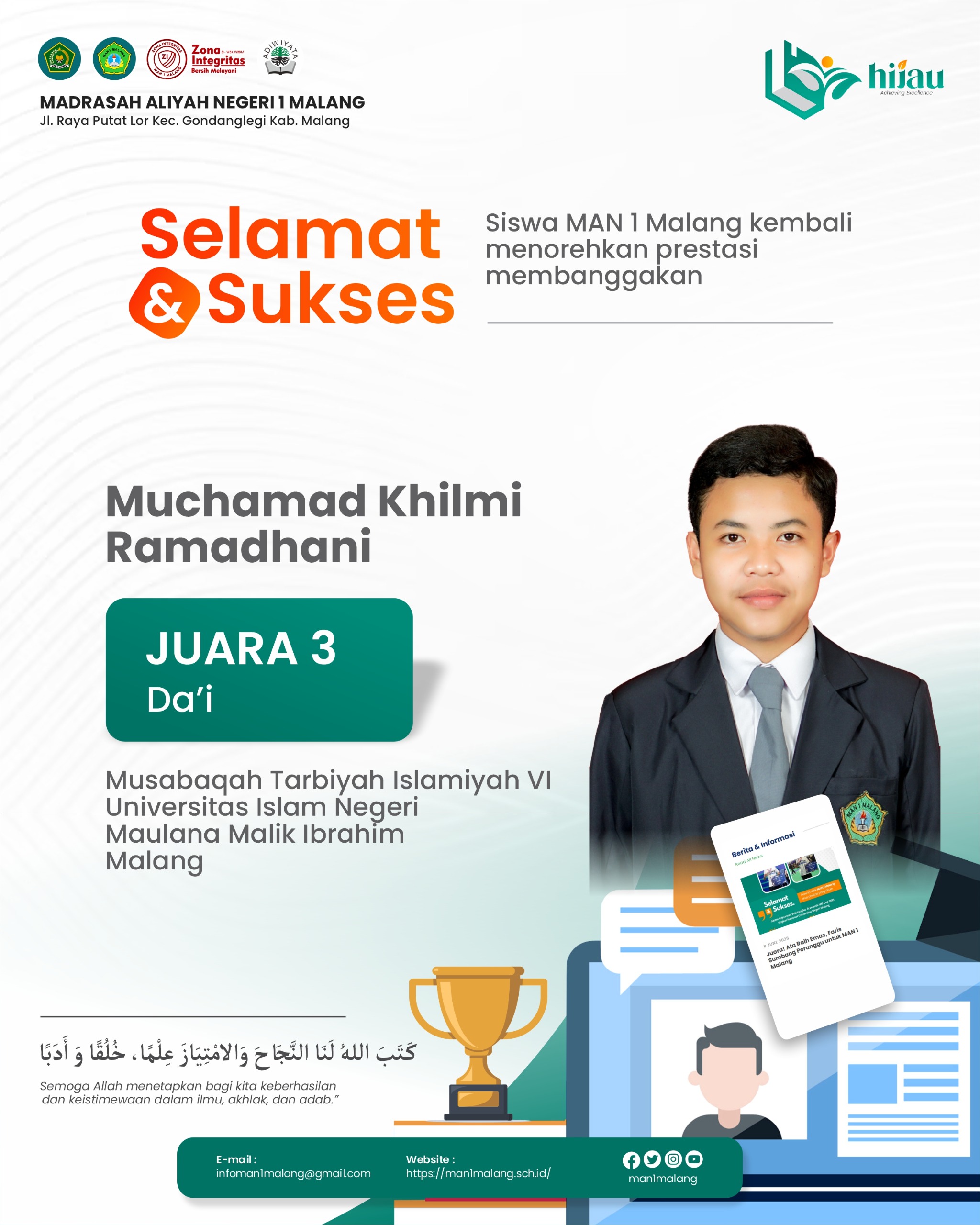 Kab. Malang (MAN 1 Malang) – Salah satu peserta didik MAN 1 Malang kembali menorehkan prestasi di tingkat perguruan tinggi. Muchamad Khilmi Ramadhani berhasil meraih Juara 3 dalam Musabaqah Tarbiyah Islamiyah (MTI) VIyang diselenggarakan oleh Universitas Islam Negeri Maulana Malik Ibrahim (UIN) Malang. Kompetisi ini diikuti oleh puluhan peserta dari berbagai sekolah dan madrasah di Jawa Timur. Babak penyisihan dilakukan secara online, sedangkan babak...Read More