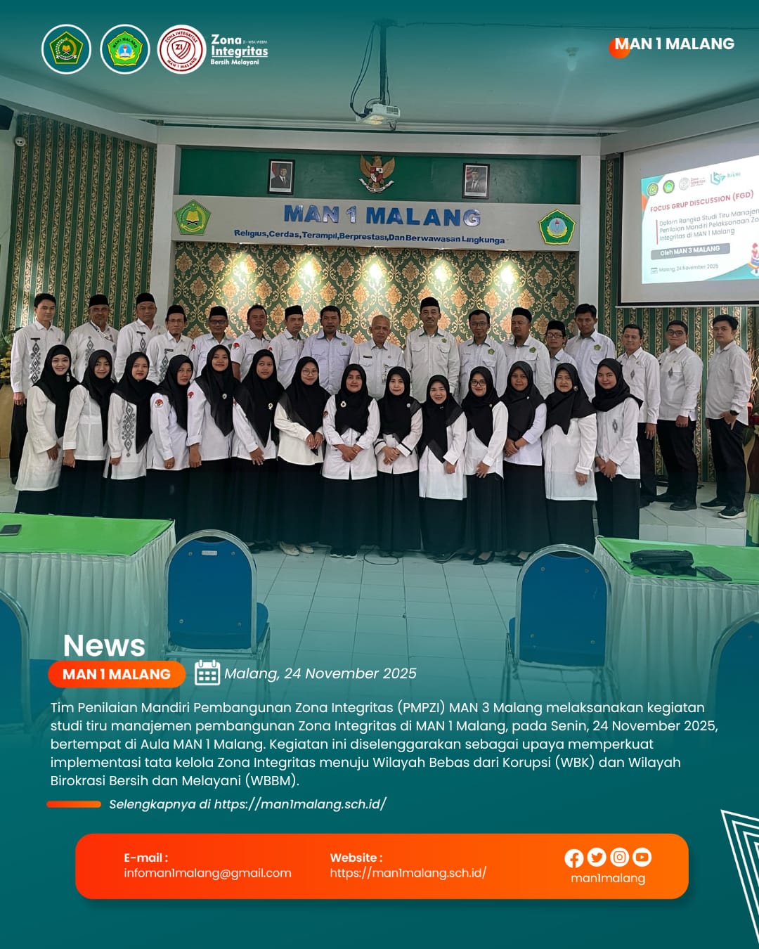 Kab. Malang (MAN 1 Malang) — Tim Penilaian Mandiri Pembangunan Zona Integritas (PMPZI) MAN 3 Malang melaksanakan kegiatan studi tiru manajemen pembangunan Zona Integritas di MAN 1 Malang, pada Senin, 24 November 2025, bertempat di Aula MAN 1 Malang. Kegiatan ini diselenggarakan sebagai upaya memperkuat implementasi tata kelola Zona Integritas menuju Wilayah Bebas dari Korupsi...Read More