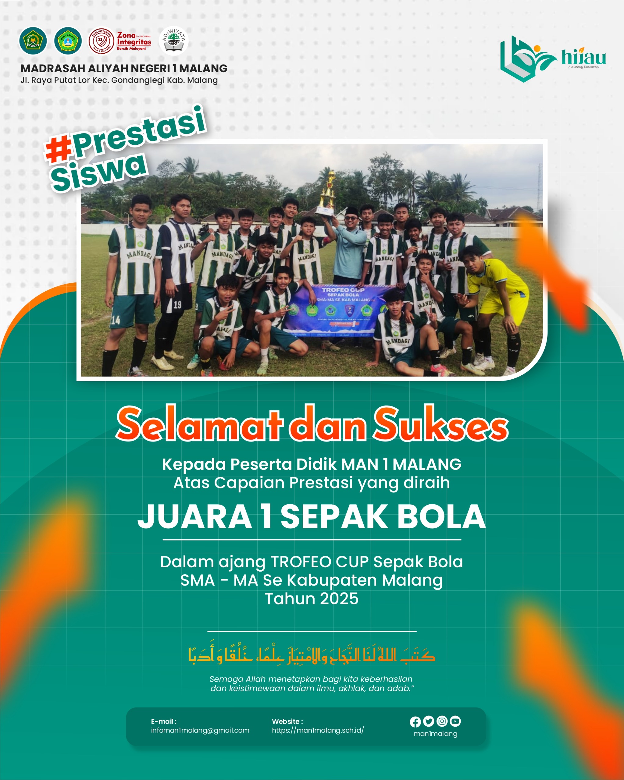 Kab. Malang (MAN 1 Malang) — Kabar membanggakan datang dari MAN 1 Malang. Tim sepak bola MAN 1 Malang berhasil menorehkan prestasi gemilang dengan meraih Juara 1 dalam ajang Trofeo Cup Sepak Bola SMA–MA se-Kabupaten Malang Tahun 2025, yang diselenggarakan pada Sabtu, 12 Oktober 2025, di Lapangan Gondanglegi, Kabupaten Malang. Turnamen yang diikuti oleh sejumlah sekolah dan madrasah unggulan di Kabupaten Malang ini berlangsung...Read More