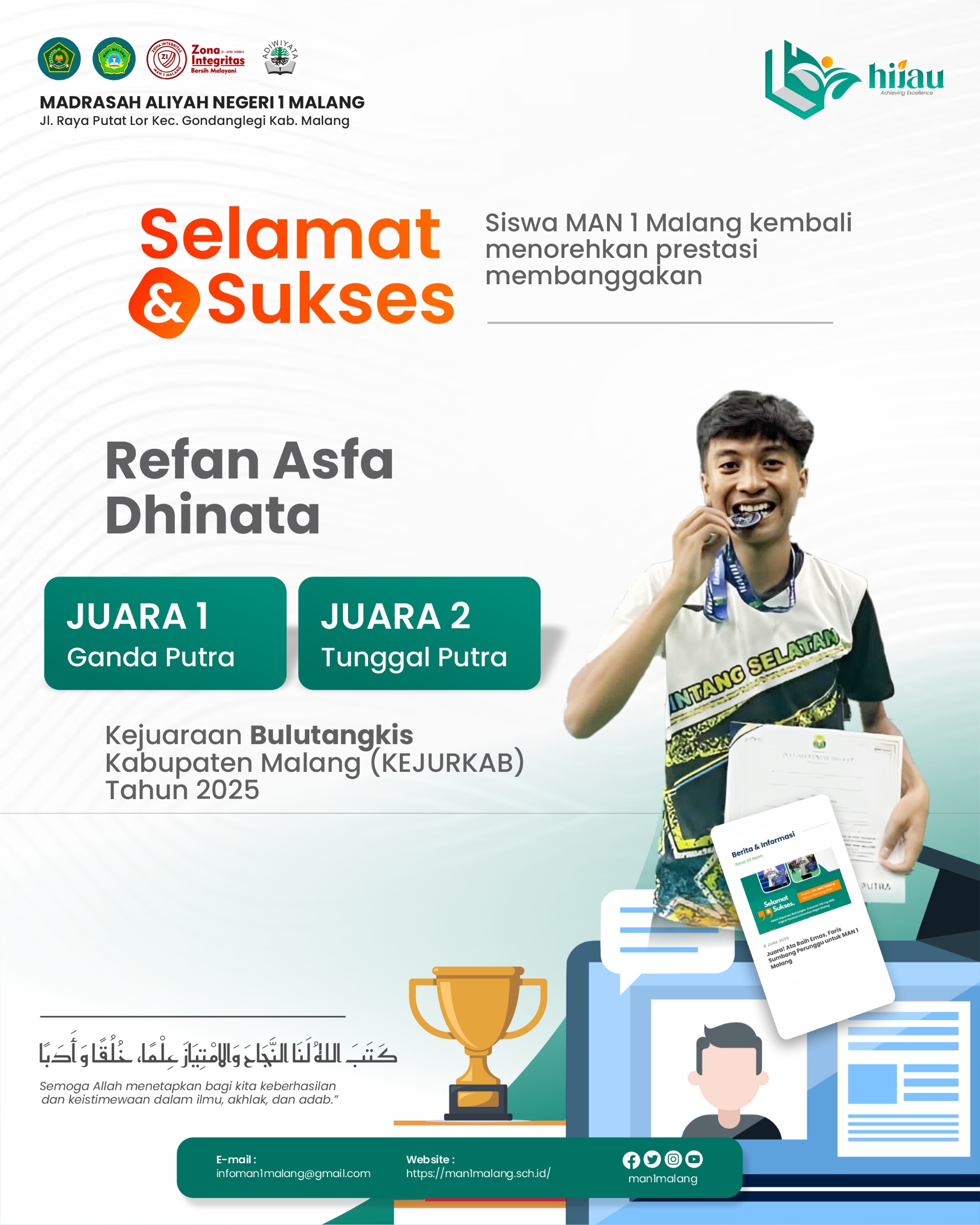 Kab. Malang (MAN 1 Malang) —Prestasi membanggakan kembali diraih oleh salah satu siswa Madrasah Aliyah Negeri (MAN) 1 Malang. Refan Asfa Dhinata, siswa berprestasi dari madrasah ini, berhasil meraih Juara 1 Ganda Putra dan Juara 2 Tunggal Putra dalam Kejuaraan Bulutangkis Kabupaten Malang (KEJURKAB) Tahun 2025 yang digelar di Gor Bulutangkis Gondanglegi, Kabupaten Malang, pada tanggal 10–12 Oktober 2025. Kompetisi tingkat kabupaten ini diikuti...Read More