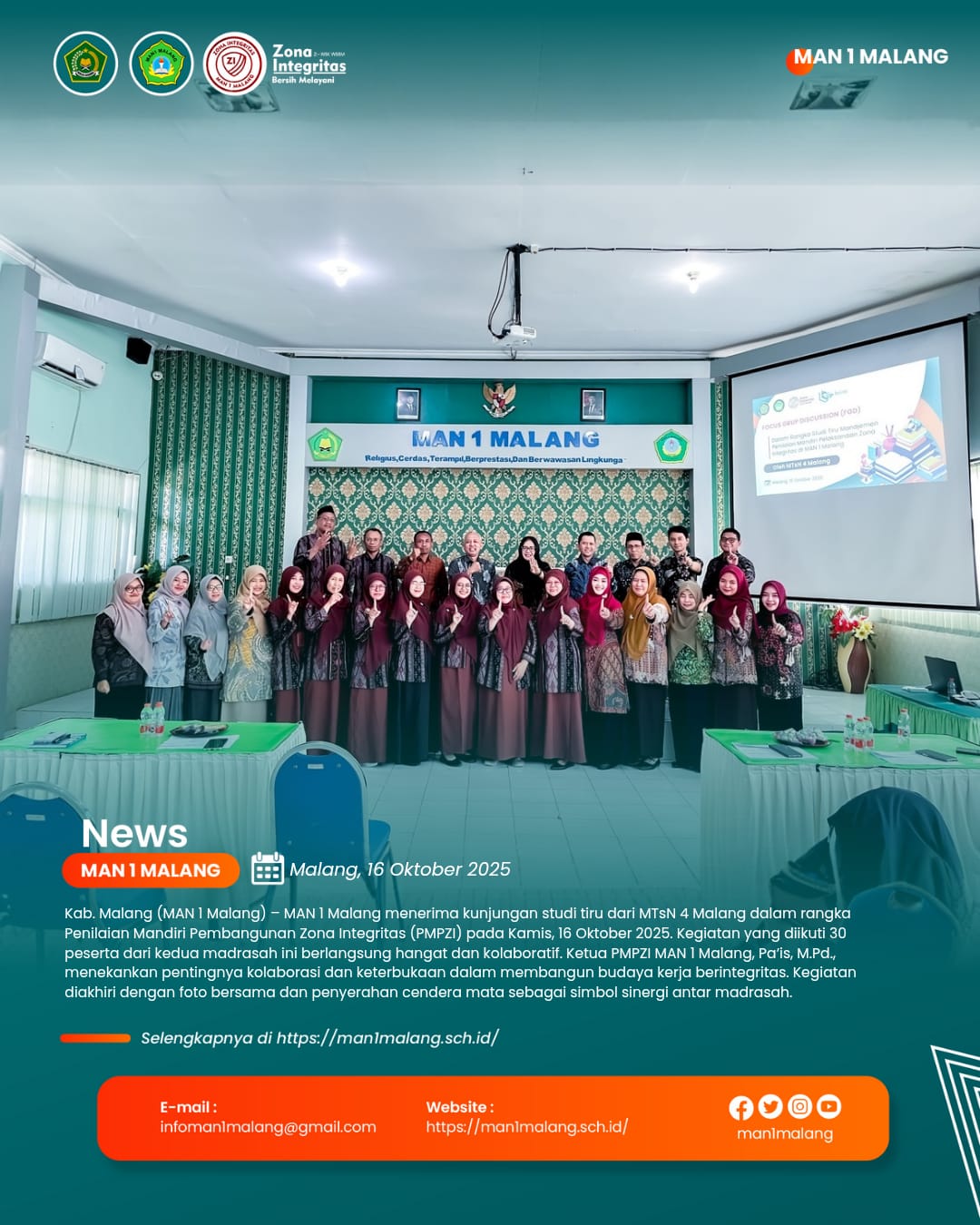 Kab. Malang (MAN 1 Malang) – MAN 1 Malang menerima kunjungan studi tiru dari MTsN 4 Malang dalam rangka kegiatan Penilaian Mandiri Pembangunan Zona Integritas (PMPZI). Kegiatan ini dilaksanakan pada Kamis, 16 Oktober 2025, mulai pukul 13.00 WIB hingga selesai, bertempat di Aula Serbaguna MAN 1 Malang. Sebanyak tiga puluh peserta hadir dalam kegiatan tersebut, terdiri atas...Read More