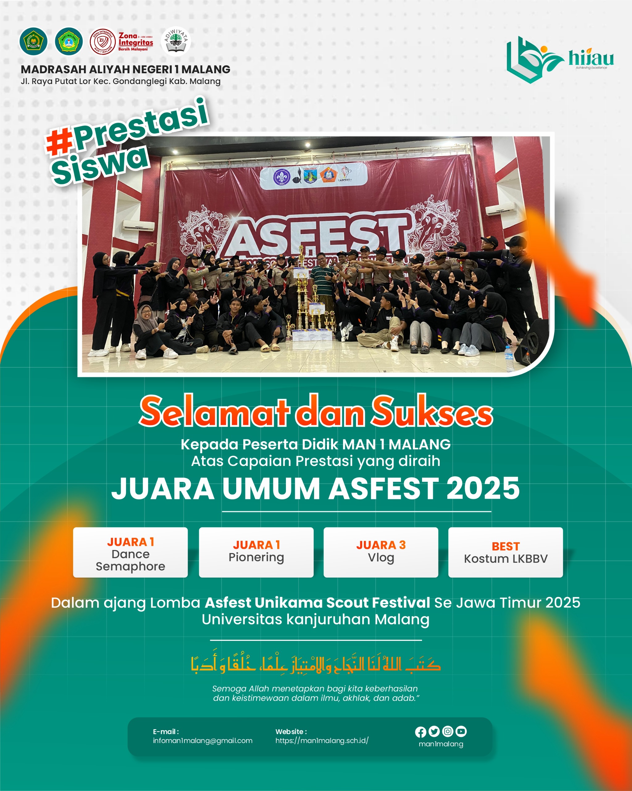 Kab. Malang (MAN 1 Malang) — Kabar membanggakan kembali datang dari Pramuka MAN 1 Malang yang dikenal dengan nama PRAPANCA (Pramuka Pati Unus Putri Campa). Dalam ajang bergengsi Asfest Unikama Scout Festival Se-Jawa Timur 2025 yang diselenggarakan di Universitas Kanjuruhan Malang, kontingen MAN 1 Malang berhasil menorehkan prestasi gemilang dengan meraih Juara Umum ASFEST 2025. Kegiatan yang diikuti oleh berbagai...Read More