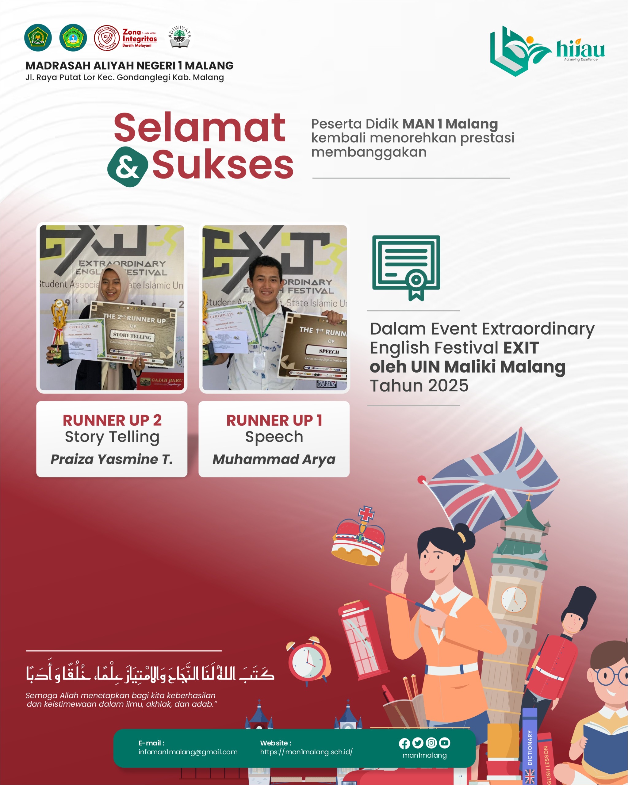 Kab. Malang (MAN 1 Malang) – Dua siswa MAN 1 Malang kembali menorehkan prestasi membanggakan dalam ajang EXIT 2025 (English eXhibition and Interactive Tournament) yang diselenggarakan oleh Fakultas Humaniora Universitas Islam Negeri (UIN) Maulana Malik Ibrahim Malang. Kegiatan ini berlangsung pada tanggal 19 Oktober 2025, di kampus UIN Maulana Malik Ibrahim Malang, Jl. Gajayana No....Read More