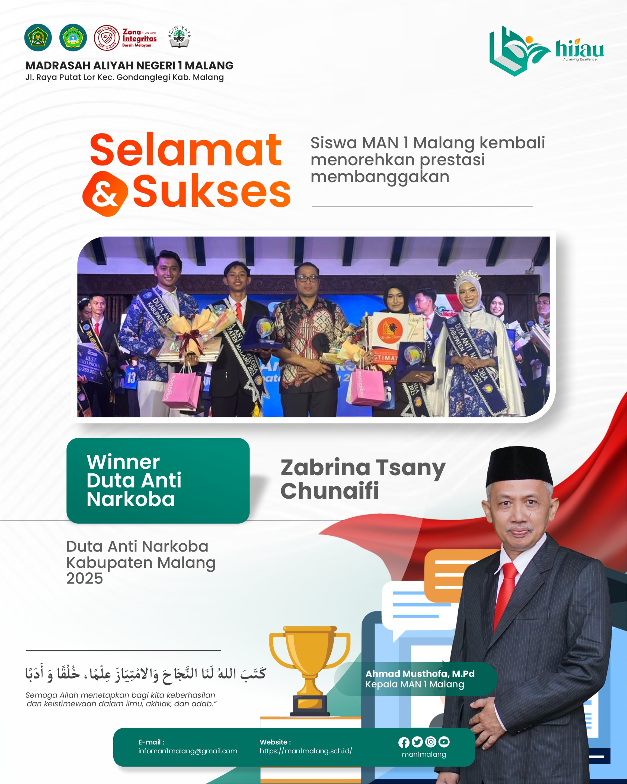 Malang — MAN 1 Malang kembali menorehkan prestasi membanggakan melalui siswinya, Zabrina Tsany Chunaifi, yang berhasil meraih Juara 1 Duta Anti Narkoba Kabupaten Malang 2025. Ajang pemilihan ini semakin istimewa karena kembali diselenggarakan setelah sempat vakum sejak tahun 2021, sekaligus menjadi ruang bagi para pelajar untuk berperan aktif dalam edukasi dan kampanye pencegahan penyalahgunaan narkoba....Read More