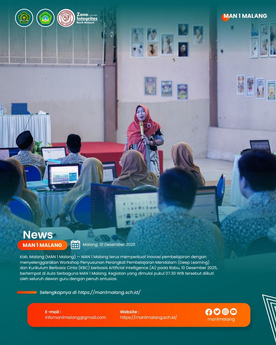 Kab. Malang (MAN 1 Malang) — MAN 1 Malang terus memperkuat inovasi pembelajaran dengan menyelenggarakan Workshop Penyusunan Perangkat Pembelajaran Mendalam (Deep Learning) dan Kurikulum Berbasis Cinta (KBC) berbasis Artificial Intelligence (AI) pada Rabu, 10 Desember 2025, bertempat di Aula Serbaguna MAN 1 Malang. Kegiatan yang dimulai pukul 07.30 WIB tersebut diikuti oleh seluruh dewan guru...Read More