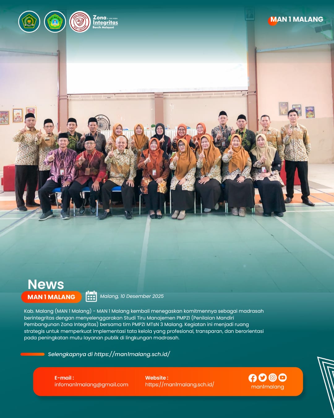 Kab. Malang (MAN 1 Malang) — Tim Penilaian Mandiri Pembangunan Zona Integritas (PMPZI) MAN 3 Malang melaksanakan kegiatan studi tiru manajemen pembangunan Zona Integritas di MAN 1 Malang, pada Senin, 24 November 2025, bertempat di Aula MAN 1 Malang. Kegiatan ini diselenggarakan sebagai upaya memperkuat implementasi tata kelola Zona Integritas menuju Wilayah Bebas dari Korupsi...Read More