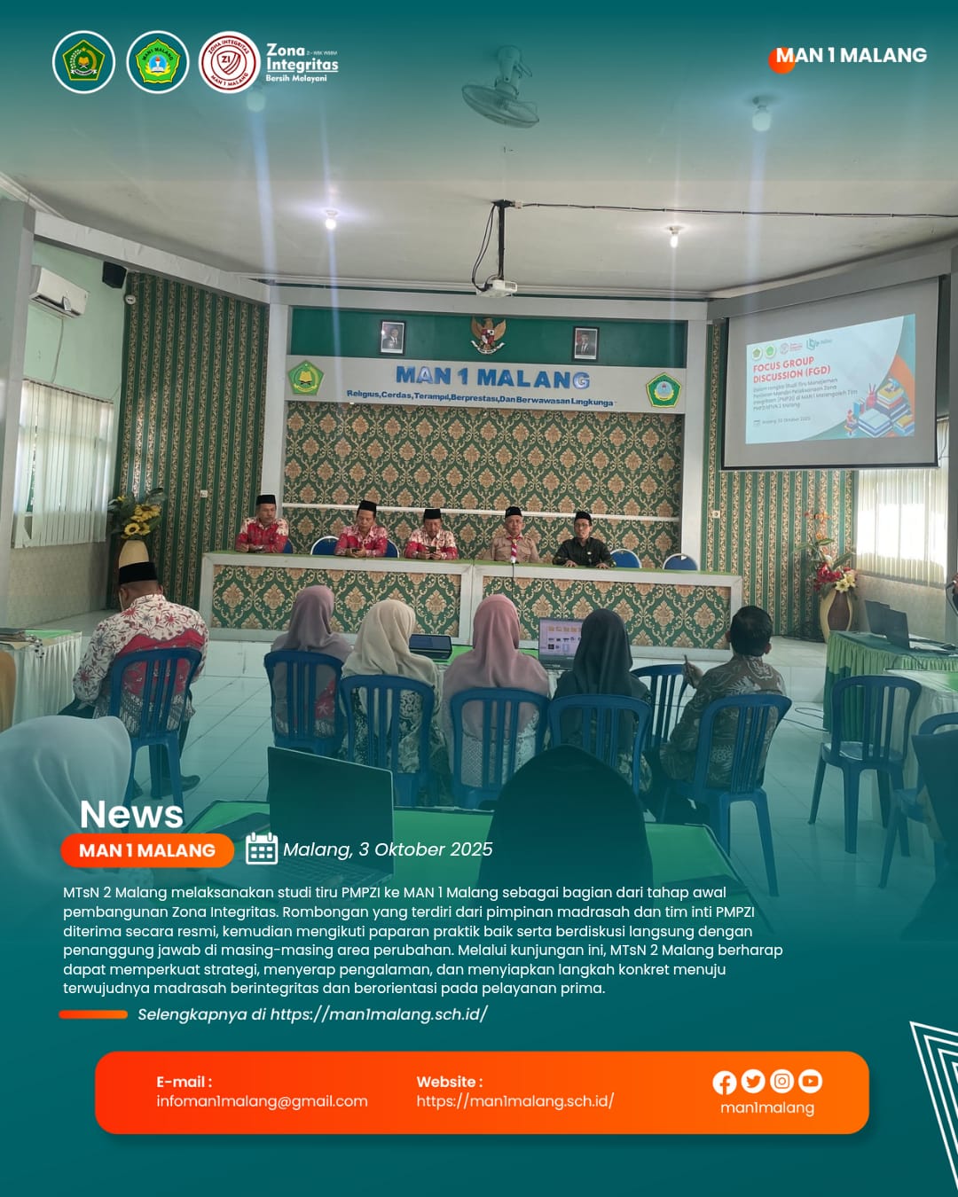 Kegiatan studi tiru ini diharapkan menjadi pijakan awal bagi MTsN 2 Malang yang saat ini masih berada pada tahap awal pembangunan PMPZI. Dengan adanya sharing pengalaman dan praktik baik dari MAN 1 Malang, MTsN 2 Malang optimis dapat memperkuat langkahnya menuju madrasah yang bersih, berintegritas, dan melayani dengan sepenuh hati.(vira)