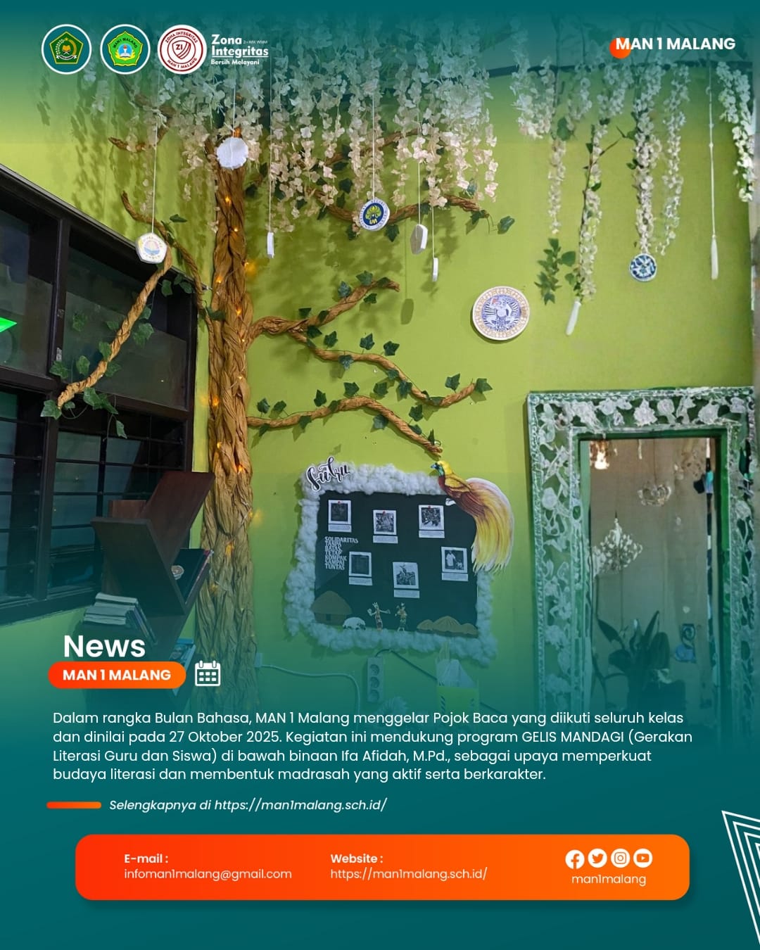 Kab. Malang (MAN 1 Malang) — Dalam rangka memperingati Bulan Bahasa dan Sastra Nasional, MAN 1 Malang menggelar kegiatan “Pojok Baca”, yang menjadi salah satu rangkaian acara literasi selama bulan Oktober. Kegiatan ini diikuti oleh seluruh kelas, dan proses penilaiannya dilaksanakan pada Senin, 27 Oktober 2025.