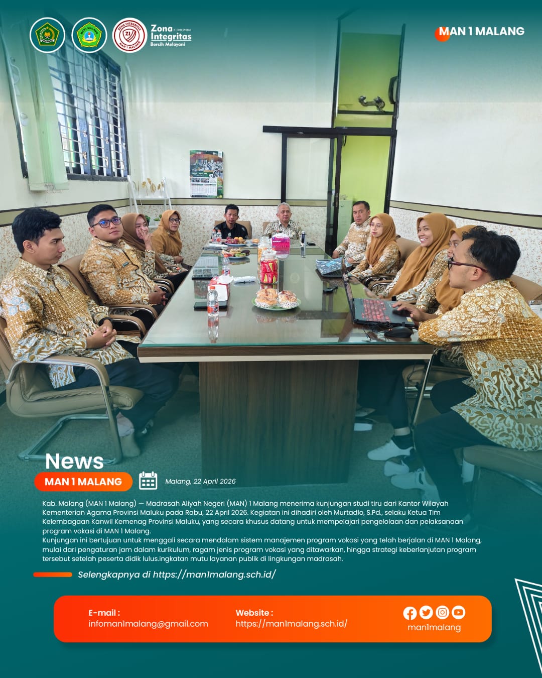 Kab. Malang (MAN 1 Malang) — Madrasah Aliyah Negeri (MAN) 1 Malang menerima kunjungan studi tiru dari Kantor Wilayah Kementerian Agama Provinsi Maluku pada Rabu, 22 April 2026. Kegiatan ini dihadiri oleh Murtadlo, S.Pd., selaku Ketua Tim Kelembagaan Kanwil Kemenag Provinsi Maluku, yang secara khusus datang untuk mempelajari pengelolaan dan pelaksanaan program vokasi di MAN 1 Malang.